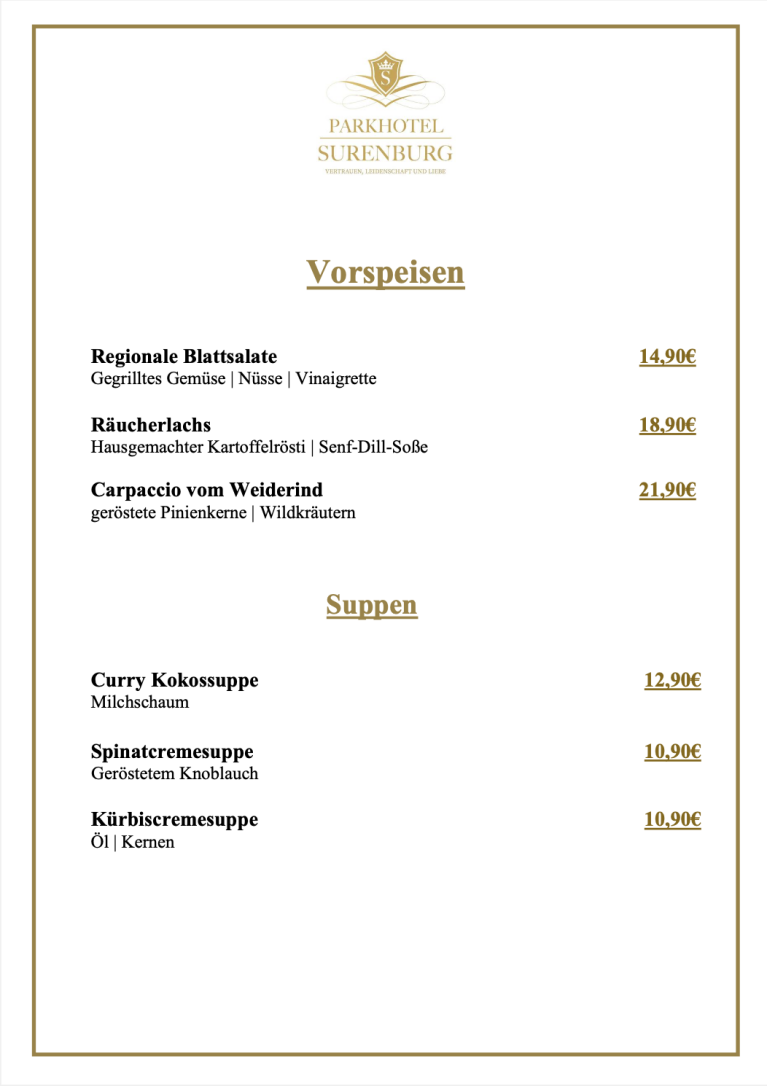 Gemütlichkeit und Eleganz setzen aber vornehmlich nur den Rahmen für die Kür eines jeden Restaurants - unser Restaurant Surenburg überzeugt mit hochwertigsten Speisen und Gerichten. Frisch zubereitet aus regionalen und internationalen Zutaten, teilweise sogar aus der Produktion der Baronenfamilie Heereman selbst.