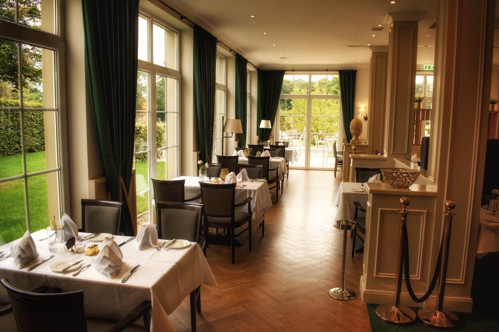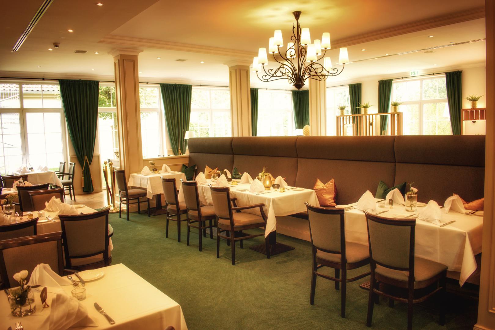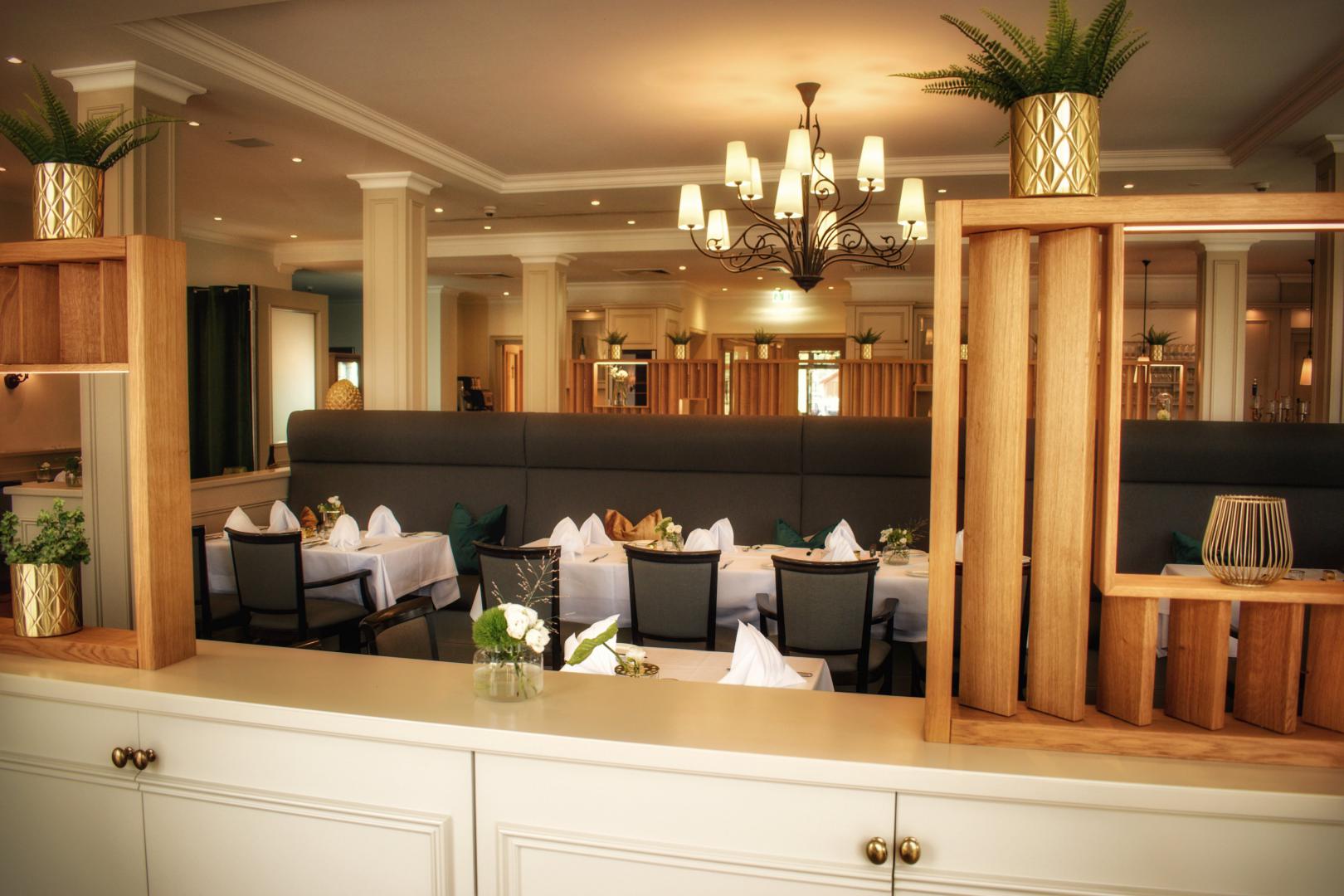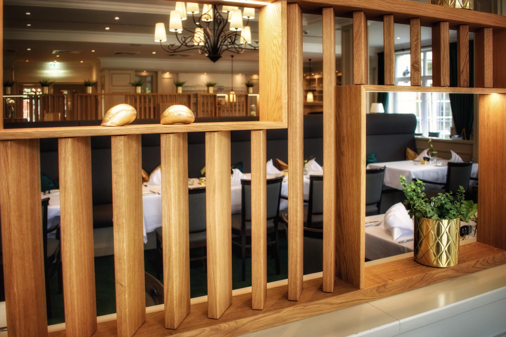 Edle Gold- und gedämpfte Grüntöne verleihen dem Speise- und Frühstücksrestaurant die adlige Note um seinem benachbarten Namensgeber, der prächtigen Surenburg, gerecht zu werden.
