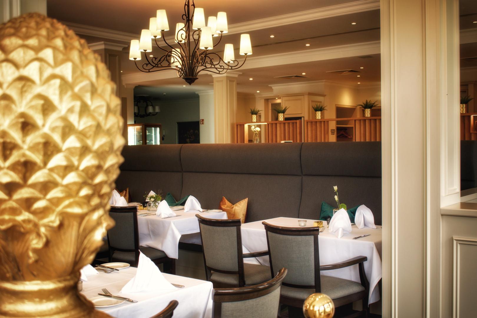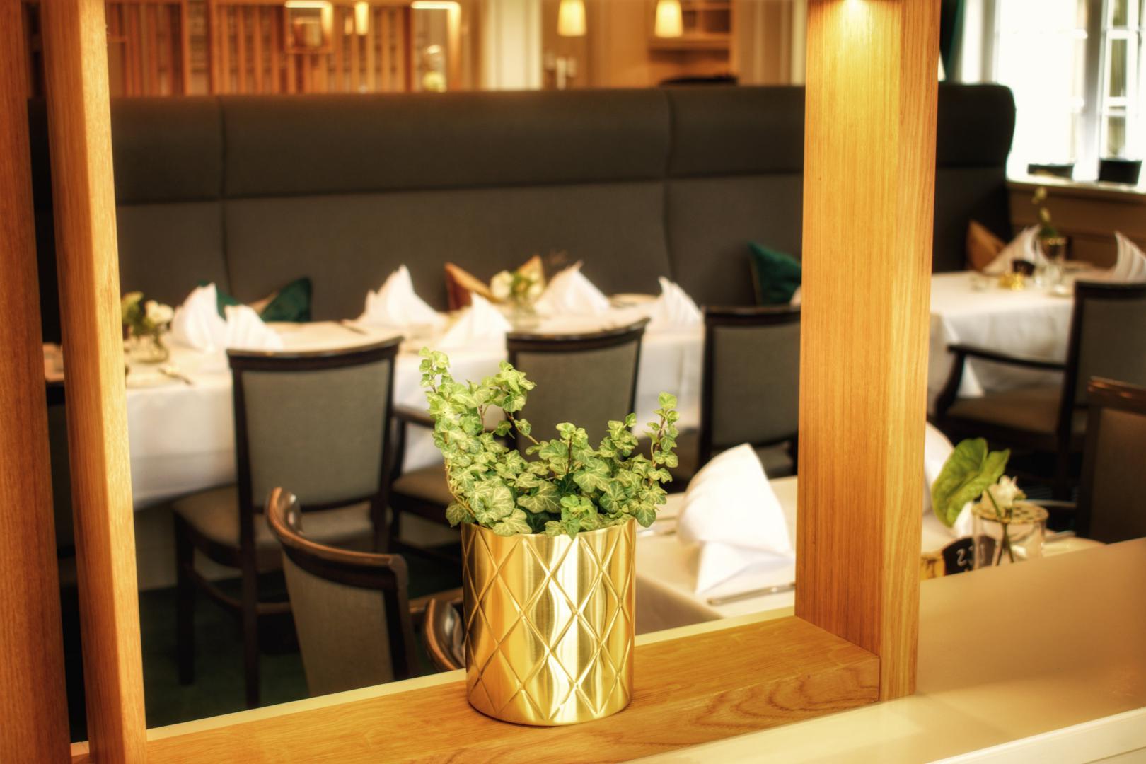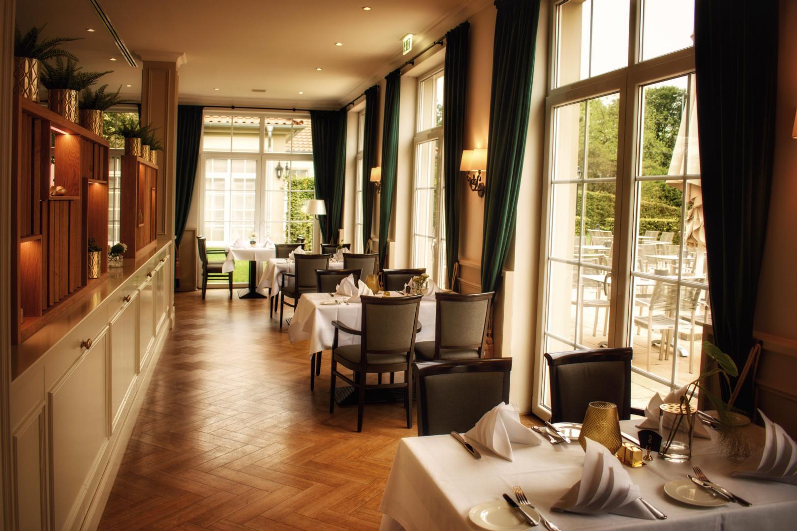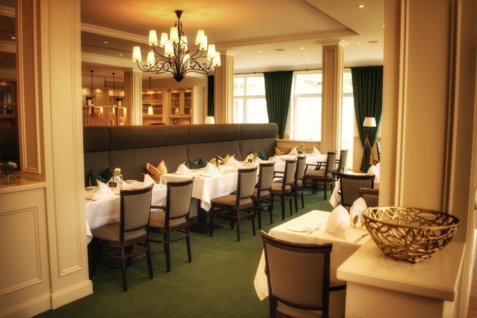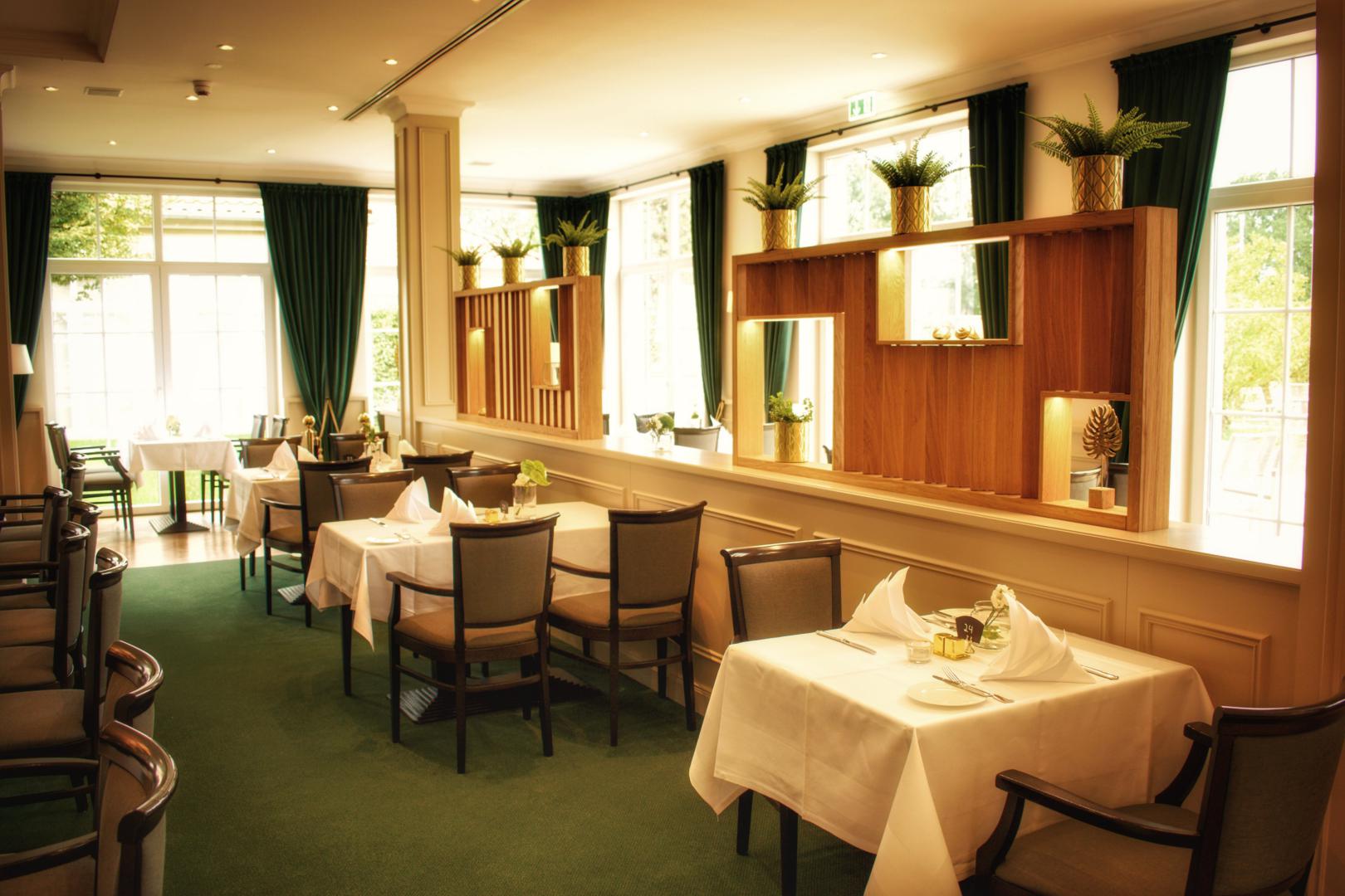 Edle Gold- und gedämpfte Grüntöne verleihen dem Speise- und Frühstücksrestaurant die adlige Note um seinem benachbarten Namensgeber, der prächtigen Surenburg, gerecht zu werden.