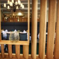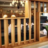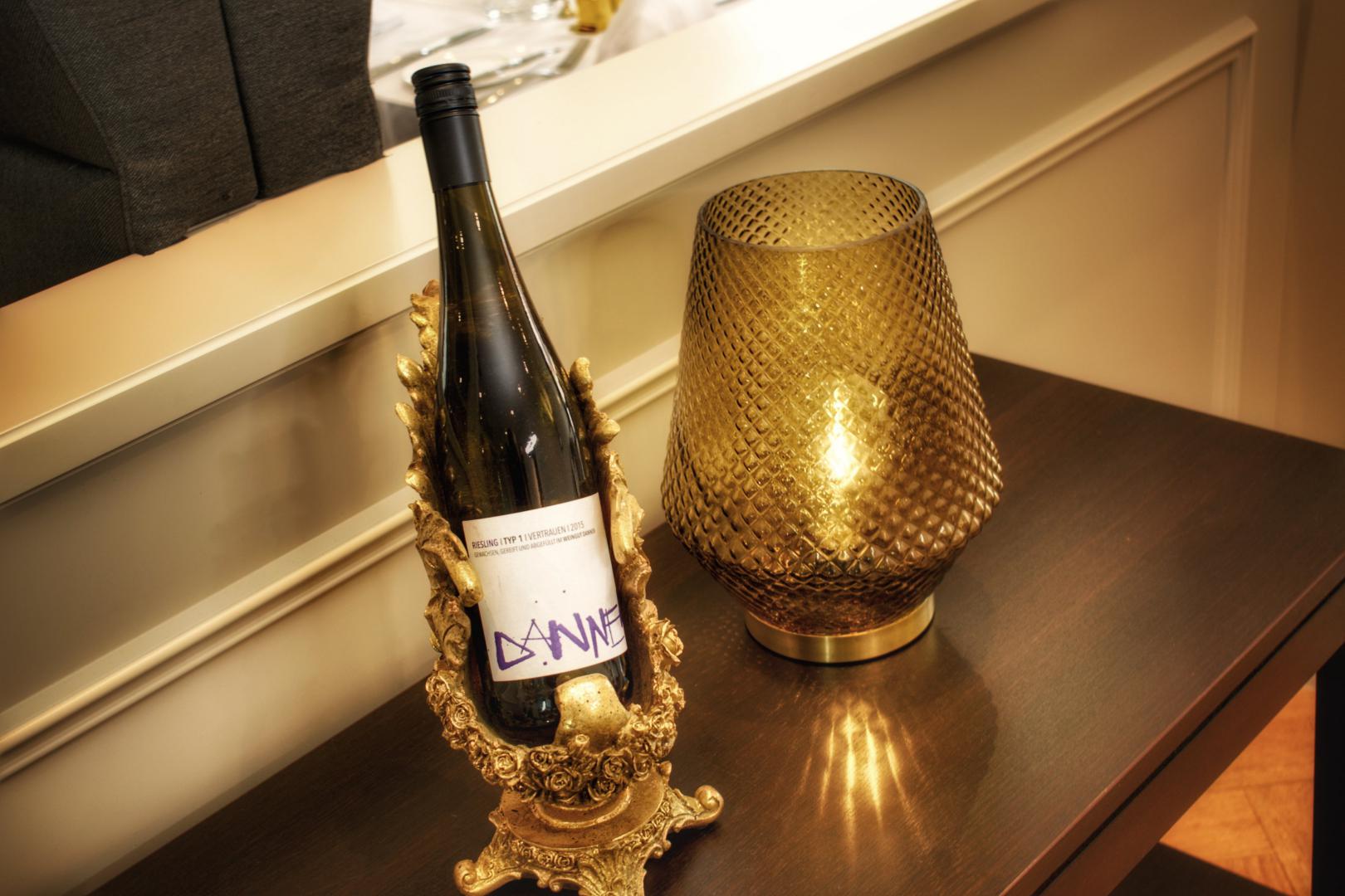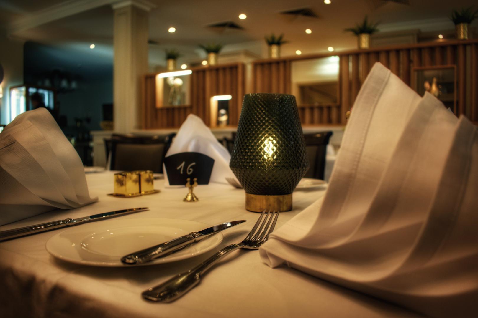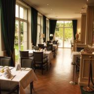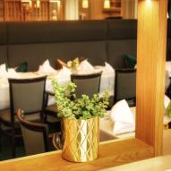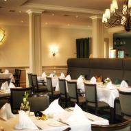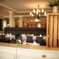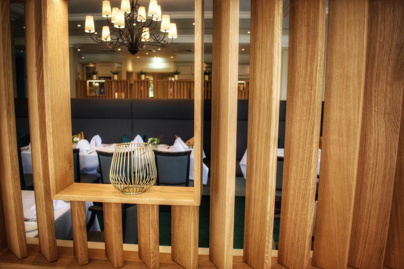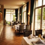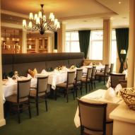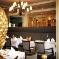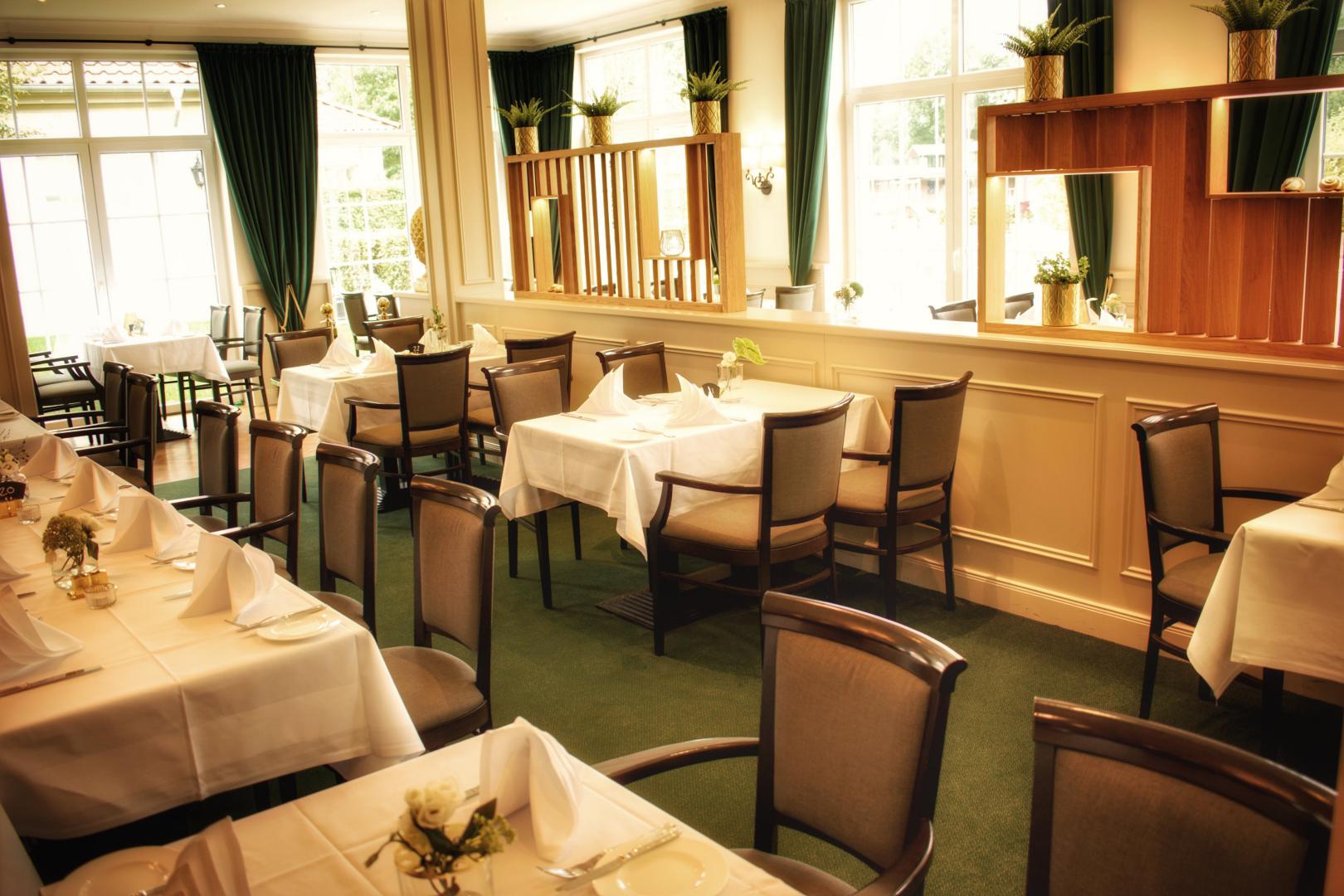 Edle Gold- und gedämpfte Grüntöne verleihen dem Speise- und Frühstücksrestaurant die adlige Note um seinem benachbarten Namensgeber, der prächtigen Surenburg, gerecht zu werden.